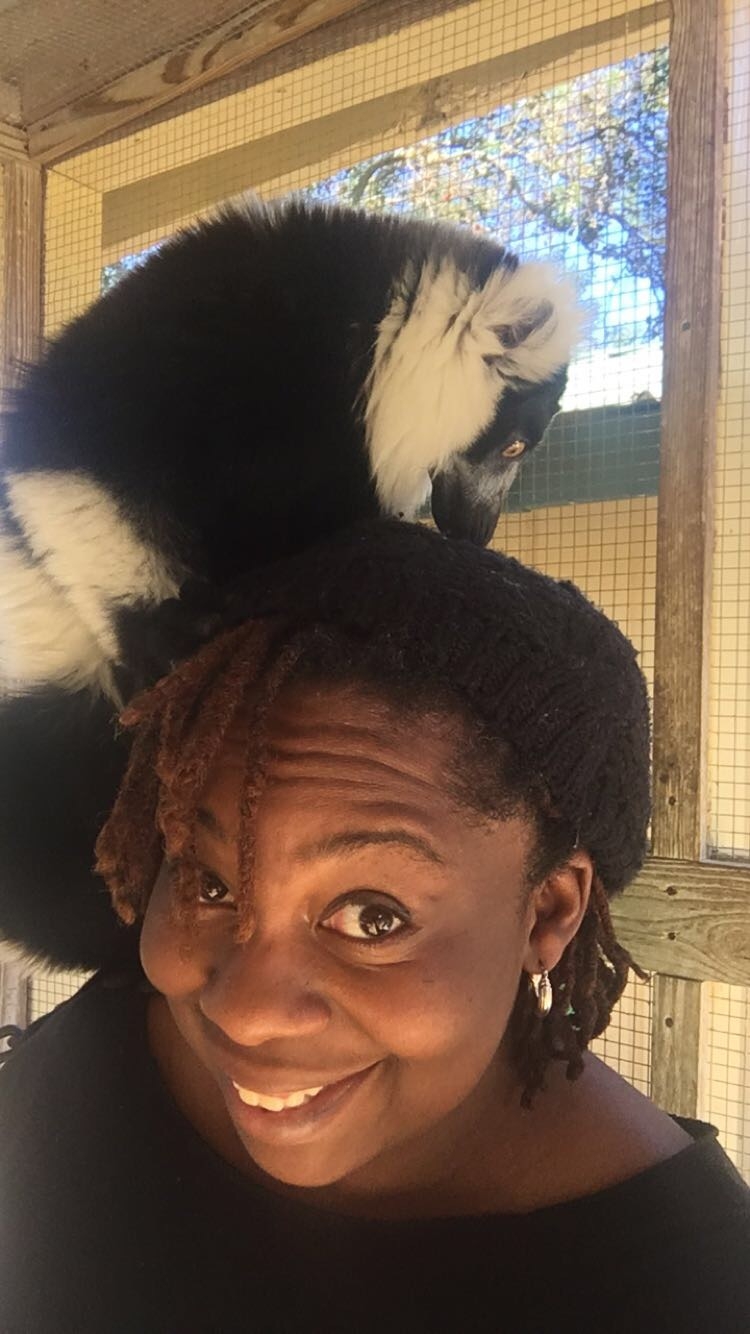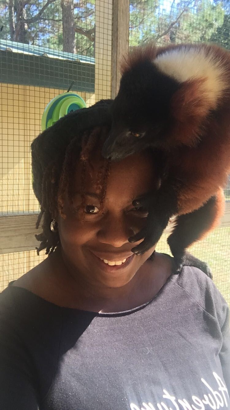 I was instructed to come inside and sit down on one of the benches and just let them come to me. It took no time at all for them to notice that I was there. They were all over me! The crawled in my lap and wanted to touch my face. Then they discovered my hair which probably smelled like the yummy oils and coconut oil that I use. They were really enjoying grooming my locs.