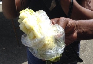 As we were heading to Maracas Beach we stopped at a popular lookout point that looks down below at the famed Maracas Bay. There was a really neat fruit stand full of local treats and we were fortunate enough to have our cab driver, Robert, hand-pick a couple of his personal favorites. First we tried red sweet pommecythere. These are a locally grown fruit that have been preserved and sweetened with the appearance of a very large grape. This was not my favorite thing from the fruit stand; it was a bit too sweet for my liking. We also tried pineapple chow. Pineapple chow is pineapple soaked in garlic, cilantro, hot peppers, and other seasoning. It’s very sweet at first and then the heat from the spice and peppers kicks in. I’m not a huge fan of spicy but this wasn’t bad. If you like things with sweet heat then you will love this snack.