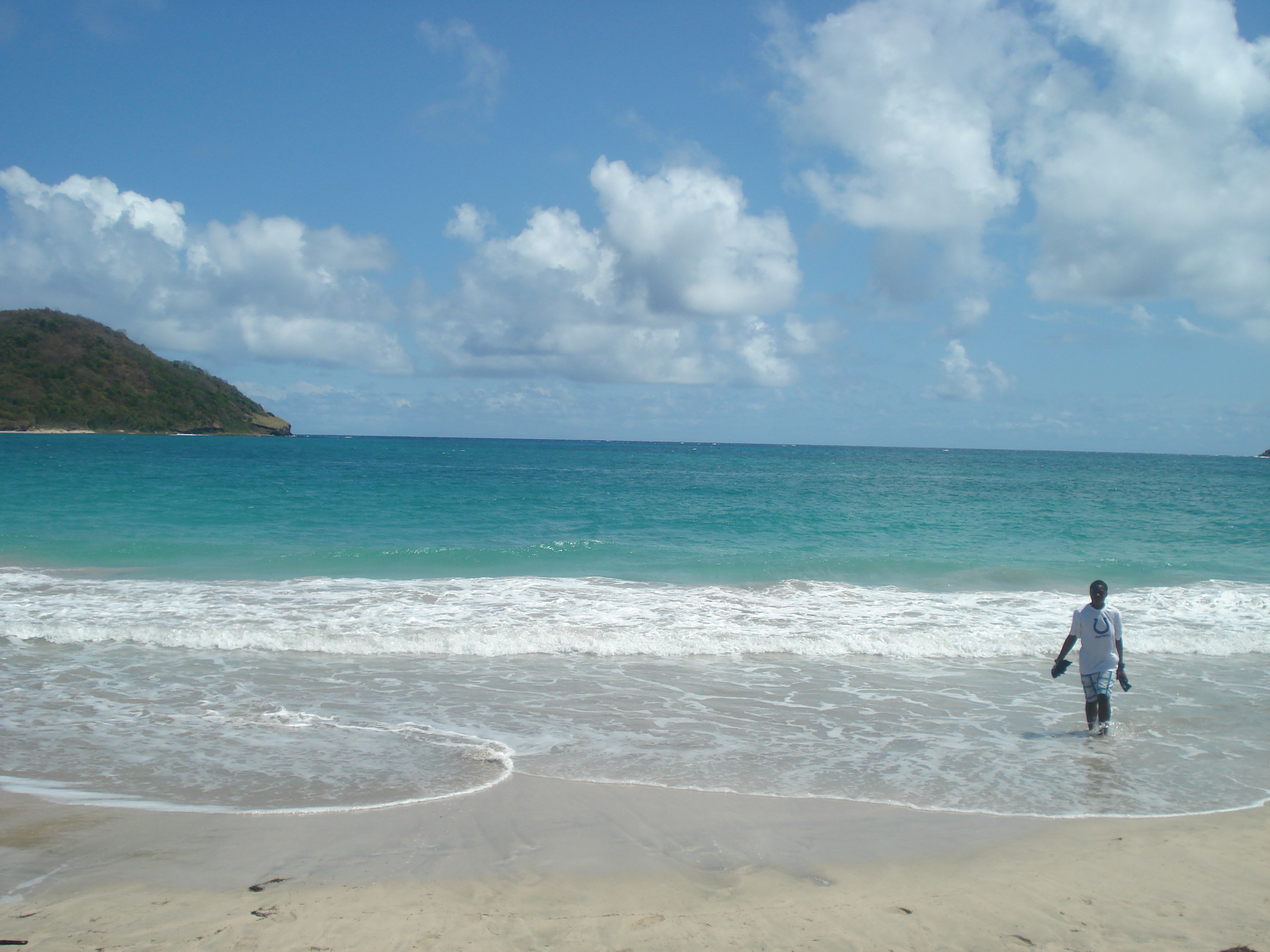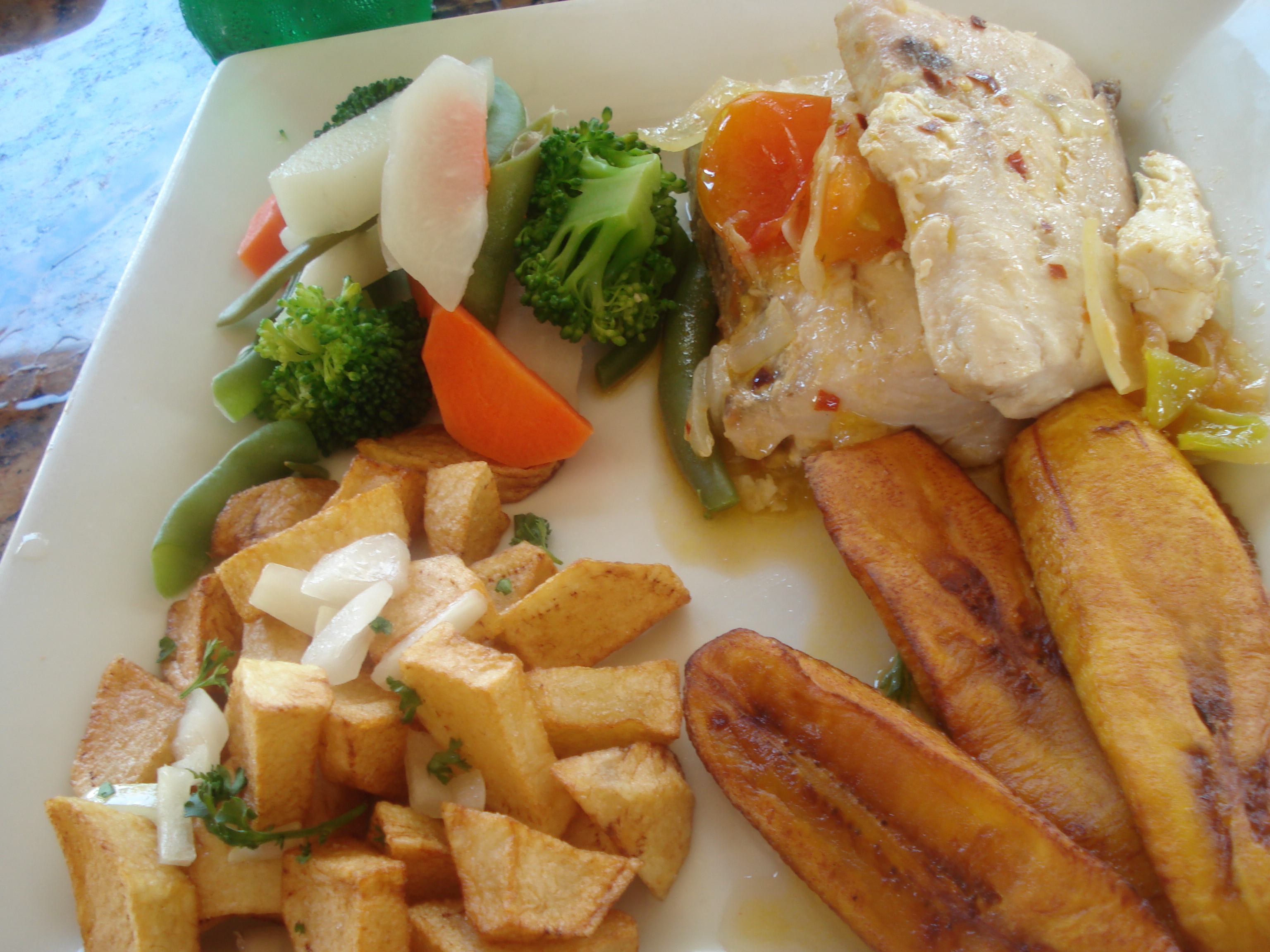 We were back on the bumpy, winding road for what seemed like hours. Just when it seemed like the chorus of hungry grumbles from our bellies would soon become unbearable, we saw it. Right there off of a sandy path from the road was an open air restaurant situated on the beach overlooking turquoise waters, with small hilly islands setting the back drop in the distance. It was almost deserted except for a few wind surfers in the water and 3 or 4 people sun-bathing. This was Eden. Once that ocean breeze hit my face and I smelled the food in the air, I was in a trance. I wanted to stay there and never come back. The Island Breeze open air restaurant served up the freshest king fish filet, vegetables in garlic sauce, and a starchy potato like root vegetable (similar to yucca). It was divine. I was so relaxed just listening to the crashing waves and looking out at the stunning seascape. I must find my way back to Sandy Beach in Vieux Fort again when I can come and spend more time. Alas, reality set in that we were on the complete opposite side of the island from the port and we had a ship to catch.