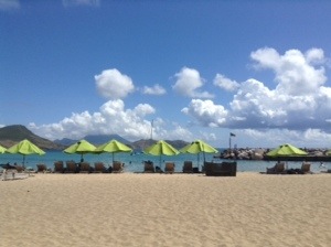 We wanted to spend the last half of the day on the beach. At the recommendation of one of our zip-line guides, we caught a taxi to Carambola Beach Club for a day of relaxation. On the ride over we stopped at a famed lookout point where you can actually gaze down at the Atlantic Ocean on your left and the Caribbean Sea on your right with the sister island of Nevis in the backdrop. It makes for some absolutely awesome photographs.