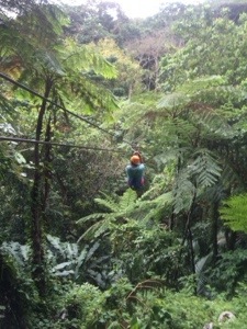 The guides had fresh tropical fruit waiting for us after we explored the waterfall. It was just enough of a sugar rush to propel us onward to the next half of our adventure….time for ziplining!!! It was gorgeous. I didn’t get stuck going across the line, which was my biggest concern. We zipped from 3 different platforms but it just wasn’t enough. I could have done it 10 more times and still not been satisfied. Looking out at the greenery, listening to the Coqui frogs chirp their song, it was just a magnificent ending to the day. After making our descent back down out of the forest we were treated to a wonderful spread of authentic Puerto Rican food and homemade sangria in an open gondola with a spectacular lunch view.