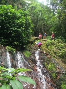 It was beautiful! It was shaded and cool. The forest was so luscious and green. There were no more paved roads or pathways. This was real nature. We followed the rocks of the stream, listening to Ely’s warnings of extra slippery rocks and where we should step to avoid a fall. The rocks became boulders as we journeyed upward into the mountain. 10 minutes in and I was feeling terrified and already exhausted. We climbed like little spider monkeys over the rocks and into the stream. I stopped to catch my breath and for a split second everything in my body screamed at me to just stay there. I’d just sit right there in the cool breeze….. I’d sit there and do what exactly? Wait for 3 hours until the group returned??? That certainly wasn’t an option; I had no choice but to suck it up and press onward. Just when I thought I was ready to pass out we reached our first reward. It was a small but very scenic little waterfall.