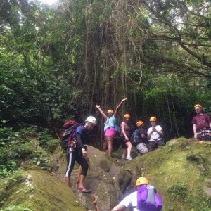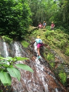 We journeyed on through more rocky paths. We had to maneuver around the edge of a deep pool. One of our group wasn’t so lucky and fell in. We climbed under things, over them, across them and contorted our bodies in all sorts of weird angles. Just when I was starting to lose my energy once again, we were rewarded with the ultimate prize. To date it’s one of the most beautiful sites I’ve ever seen in my life. It was a large rocky cave with a waterfall flowing down through an opening in the top. The mossy walls and wet rocks created a phenomenal landscape. The pictures I took with my phone came out great but they still don’t do it justice. We walked through the shallow pool and ventured deeper into the cavern. I climbed up the wet slippery rocks even deeper until I was behind the falls. As I stood there looking down and out across the forest I felt at one with nature. It was euphoric!
