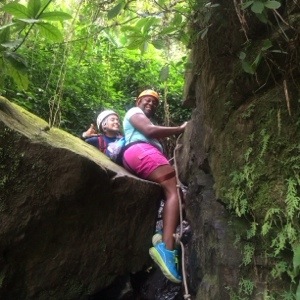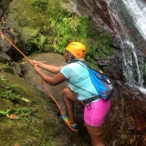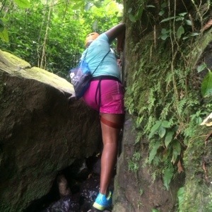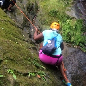 Of course that was before we approached what I like to call The Rock. It was taller, steeper, and there was water rushing down the face of this big bad rock which made it impossible to see where your grips were located. After watching some of my counterparts misstep and come sliding down the rock, I was feeling pretty intimidated. By this time our little group had become like a family. Everyone cheered each other on as we took our turns. This definitely helped me get in the zone and do what I had to do. I stood in front of the incline and prepared to face my fear. Ely yelled directions and encouragement to me and I followed her every instruction. It’s kind of like solo twister. “Place your left foot where your right hand is.” Whaaaaa??? As crazy as it sounded I did it and next thing you know I was climbing like it was nobody’s business. Up I went! I didn’t slip or falter at all and I didn’t even need the rope! I made it to the top!